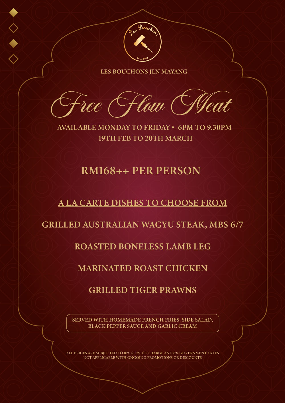Starting on 19th February until 20th March for RM168++ per person. Monday to Friday, 6PM-9:30PM🥩 Exclusively at Les Bouchons, Jln Mayang, kuala Lumpur.